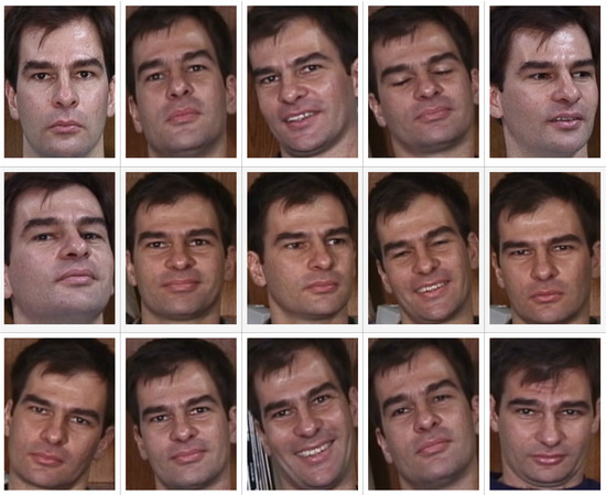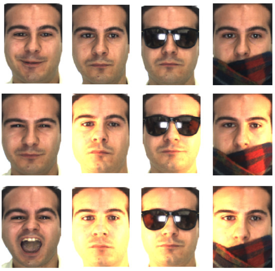 We also tested our method on the AR Dataset. In the Computer Vision Center (CVC) at the University of Alabama in Birmingham, Aleix Martinez and Robert Benavente developed this face database. It includes over 4000 color images corresponding to the faces of 126 people (70 men and 56 women). Faces seen from the front, with various expressions, lighting conditions and occlusions, are depicted in the images (sunglasses and scarf)—the samples of face variations are shown in Figure 7. The photographs were taken at the CVC in a setting where the environment was carefully monitored and controlled. The participants were not limited by what they could wear (clothes, glasses, etc.), how they made up their faces, how they styled their hair or anything else. Everyone participated in two different sessions, each spaced out by one week and a half (14 days) [42].