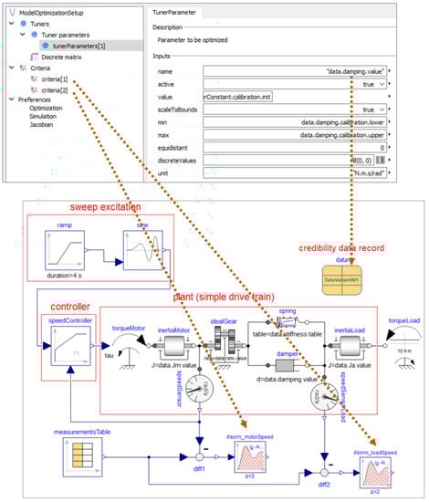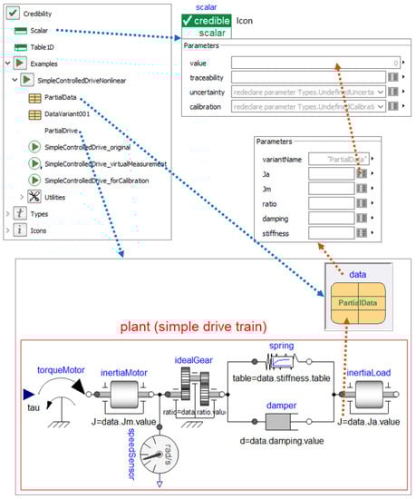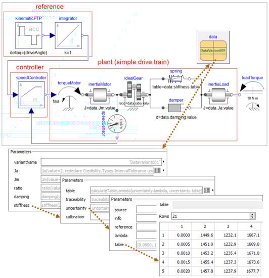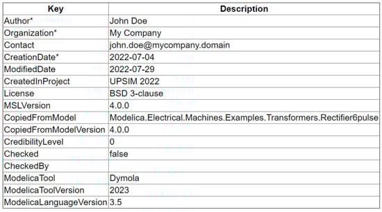 Each of these main categories can be further structured by subcategories, till a hierarchical level is reached, where each information can be stored as key–value pair, similar to the Simulation Resource Meta Data (SRMD) format proposed in []. This structure also allows references to external data such as measurements or supplier data sheets. A first proposal on how to store a minimal set of metadata is shown in Figure 1. For the corresponding Modelica code, see Listing A1 in Appendix A.