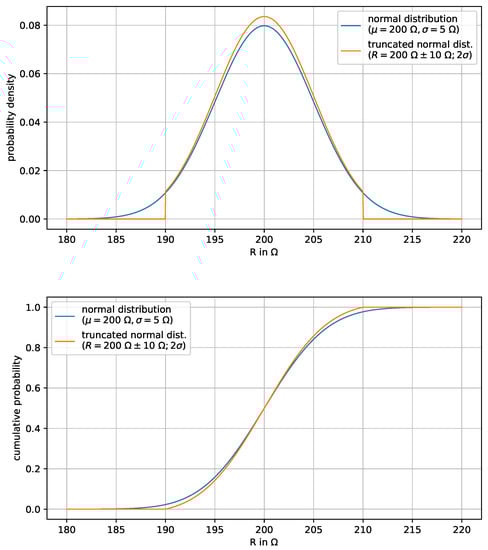 Probability density and cumulative probability of the truncated normal distribution (orange curve) of resistance ,  such that the underlying (nontruncated) normal distribution (blue curve) has mean value  and standard deviation . The probability is 100% for the truncated normal distribution that a value of R is between 190 and 210 and the probability is 95.4% for the underlying normal distribution for this range.
