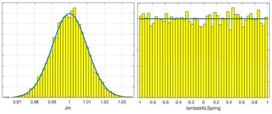 Frequency histogram for the normal distribution of parameter Jm (in ) and uniform distribution for lambdaNLSpring (dimensionless; lambdaNLSpring = 0) is the nominal value). The blue line shows the ideal probability density function and the yellow bars the sampled values.