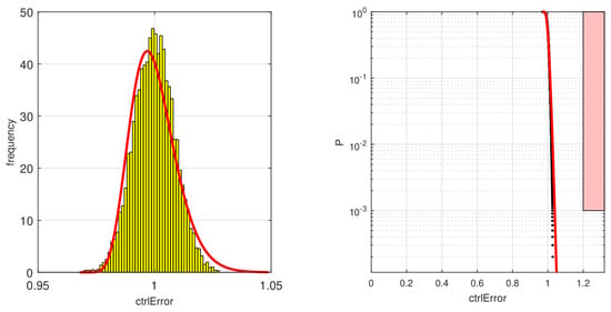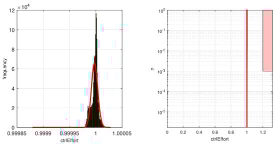 A Monte Carlo gridding run with 10,000 simulations and parameter variations was performed using the distributed computation method implemented in MOPS using multiple CPU cores. For this simple model, a single run for a 4 s long simulation took a computational time of about  s on a single core of an Intel Xeon E5-2687W CPU (https://www.intel.com/content/www/us/en/products/details/processors/xeon.html (accessed on 30 July 2022)) running at  GHz. MOPS was then used to perform a statistical analysis of the two criteria with the exported Modelica model. Hypothesized gamma distributions were fitted on the resulting criteria computations. Using the gamma distributions, a plot could be set up to calculate the risk that the criteria become larger than 20% as compared to a simulation with nominal values with a probability smaller than 0.1%. Figure 12 shows the result of this calculation for the control effort and Figure 13 for the control error (performance).