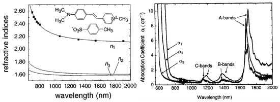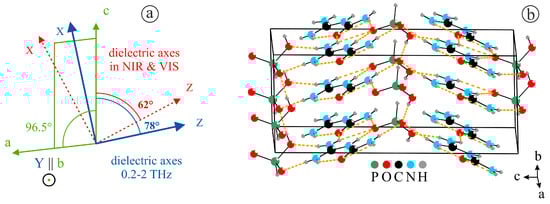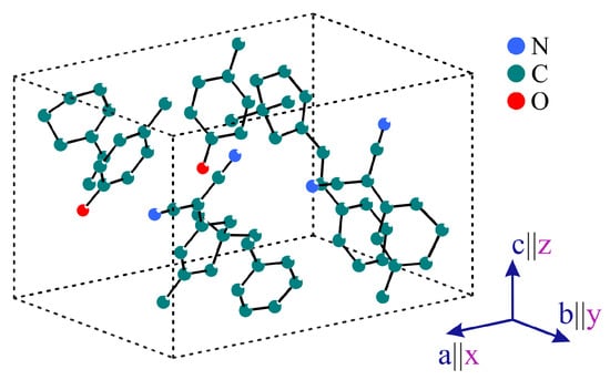 Non-centrosymmetric single crystals suitable for fsOR are semiconductors [20,21,22] such as ZnTe, CdTe, GaP, GaAs, and GaSe, ferroelectric materials [23] such as lithium niobate (LiNbO3) and lithium tantalate (LiTaO3), and organic materials [24] such as DAST (4-N,N-dimethylamino-4′-N′-methyl-stilbazolium tosylate), DSTMS (4-N,N-dimethylamino-4′-N′-methyl-stilbazolium 2,4,6-trimethylbenzenesulfonate), OH1 (2-(3-(4-hydroxystyryl)-5,5- dimethylcyclohex-2-enylidene)malononitrile), HMQ-TMS (2-(4-hydroxy-3-methoxystyryl)-1-methylquinolinium 2,4,6-trimethylbenzenesulfonate), and BNA (N-benzyl-2-methyl-4- nitroaniline). All mentioned state-of-the-art organic crystals have a molecule as a structural unit, so we can call them both organic and molecular.