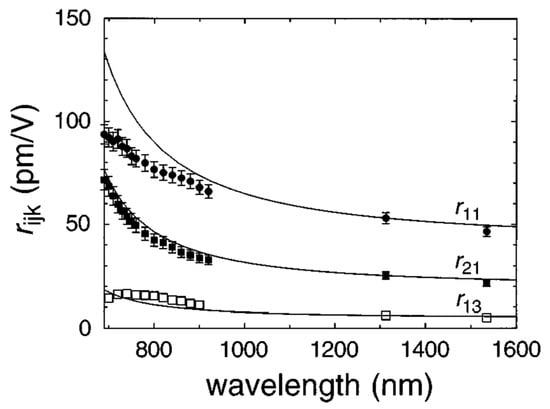 It was also shown that at THz frequencies, Miller’s rule is able to describe the nonlinear response of crystals (e.g., LiNbO3 and LiTaO3), but that it does not work in the case of crystals (e.g., ZnTe, GaAs, GaP). This is due to the fact that the ionic displacement and the driving electric field are out of phase at frequencies below the lattice resonance and are in phase above it, such that the dispersion of does not follow the linear susceptibility dispersion. This statement overcomes the limitation of the Miller rule, so it does not make any implicit assumption in relating the nonlinear susceptibility and the linear susceptibility. Instead, the dispersion is described by a frequency-independent term and Lorentz oscillators whose parameters are chosen by theoretical calculations or fitted to experimental measurements. A more complex formalism relying on the Faust–Henry model was implemented, for example, in [126,127,128,129].
