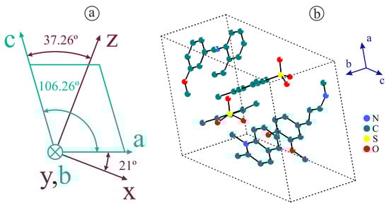 In (18), the dielectric axes of the crystal are oriented along directions , while the molecule is mostly oriented along z. is the angle between the axis i and direction z. The summation is performed over molecules in the unit cell and over the directions. is the number of equivalent positions at which the n molecules in the cell are located, as allowed by the symmetries of the crystal g point group. is a coefficient that depends on the number of molecules per unit cell and on some local field correction factors. We have supposed that the hyper-polarizability tensor exhibits the main contributing element, namely , and that the other elements can be neglected; this corresponds to the realistic case of an elongated organic molecule in which the charge transfer between the two ends of the molecule creates a large dipole.