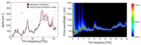 Obviously, a large nonlinear susceptibility and low THz and visible absorption coefficient are favorable for high-efficiency THz generation. In a comprehensive model of powerful terahertz sources, “side effects” must be taken into account. It is essential to take into account linear absorption in the THz range. Pump laser light absorption, especially multiphoton absorption, can cause increased carrier density and subsequently absorption in the THz range [25]. In the case of high THz fields, it is important to consider the effect of the generated THz pulse on the optical pump pulse due to their nonlinear interaction (for example, the SFG and DFG between the optical and THz fields) [26,27]. At high pump intensities, additional nonlinear effects, such as photorefraction [28] or the Kerr effect [29], can occur. In non-collinear geometries, the dephasing of the space–time coupling can lead to additional complexity.