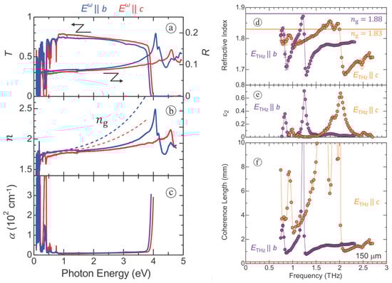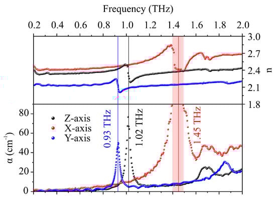 - Kuroyanagi, K.; Fujiwara, M.; Hashimoto, H.; Takahashi, H.; Aoshima, S.i.; Tsuchiya, Y. Determination of refractive indices and absorption coefficients of highly purified n-benzyl-2-methyl-4-nitroaniline crystal in terahertz frequency regime. Jpn. J. Appl. Phys. 2006, 45, L761. [Google Scholar] [CrossRef]