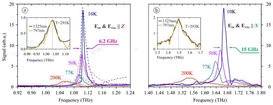 Abdulhakem Elezzabi’s group in [143,144] also experimentally investigated fsOR in a biaxial BaGa4Se7 crystal for various combinations of NIR excitation polarizations and crystal orientations. The dense phonon mode distribution of the BaGa4Se7 crystal caused narrow transmission bands in the THz frequency range with enhanced nonlinear susceptibility, thus permitting strong narrowband THz radiation generation at the frequencies of 1.97 THz and 2.34 THz. In comparison to THz radiation generated by the ZnTe crystal, the narrowband THz radiation produced by the BaGa4Se7 crystal was 4.5 times higher at 1.97 THz and 63% higher at 2.34 THz.