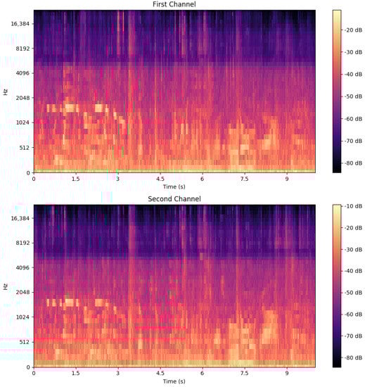 Sample spectrogram from the DCASE 2020 Task 1 Subtask A development dataset. This clip is recorded at an airport. The spectrogram of each channel from the binaural recording is depicted.