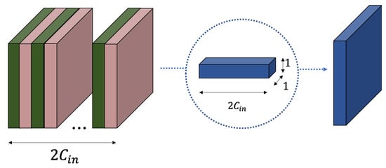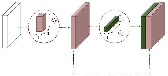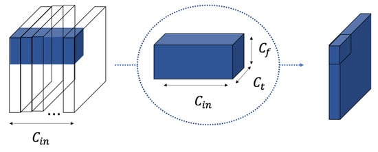 where  and  are the parameters of the convolution along the frequency and time axes of input channel k, respectively. Secondly, outputs from the frequency convolutions and time convolutions are concatenated to form intermediate input  as defined in Equation (4). Input I is fed to a 1 × 1 convolution as depicted in Figure 4. Equation (5) expresses the final output of the time-frequency separable convolution.
