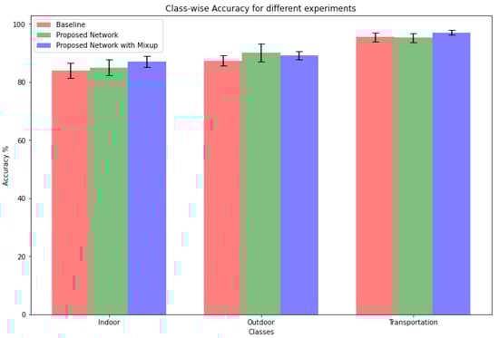 Clearly, the proposed network using time-frequency convolution outperforms the baseline system even though it is much smaller in size. The accuracy of the baseline system on average is 88.96% while the corresponding number for the proposed network is 90.15%. When mix-up data augmentation is employed during the training of the proposed architecture, the average performance increases by roughly 1% to 91.14%. Mix-up data augmentation also helps to reduce the performance variance of independent trials. In terms of log loss metric, the proposed model with mix-up shows the smallest loss, while the baseline has the largest loss on average. Overall, the proposed model with mix-up data augmentation gives the best result in both accuracy and log loss metric even though the model size is around 14 times smaller than the baseline system. Figure 5 presents the class-wise accuracy for different experimental settings. Without mix-up data augmentation during training, the proposed architecture only shows improvement for detecting the outdoor class while the accuracy of indoor and transportation classes is similar to the baseline network. When mix-up is employed, the proposed model increases in accuracy in all classes compared to the baseline network. Furthermore, in each class the proposed network with mix-up has the smallest standard deviation.