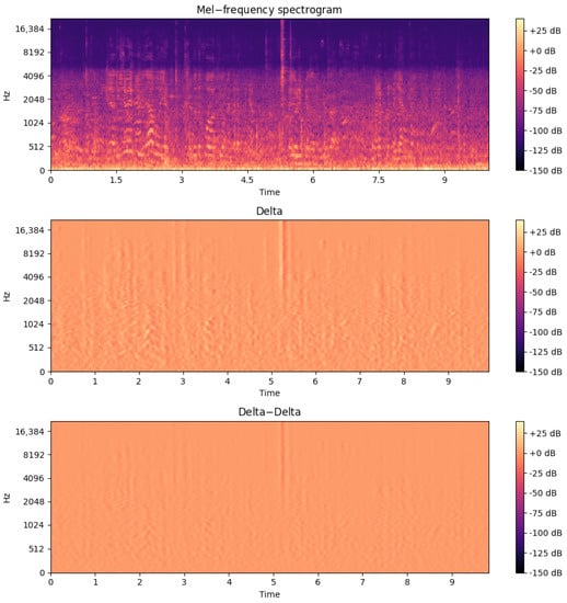 The baseline prepossessing steps convert each recording to log mel-band energy spectrograms with 128 mel bands. The number of samples in an analysis frame was 2048 with 50% hop interval. Each spectrogam was normalized into a range from 0 to 1 by its maximum and minimum values. Log-mel deltas and delta-deltas without padding were included as additional inputs into the models. The un-normalized version of an input audio recording from the dataset is given in Figure 6.