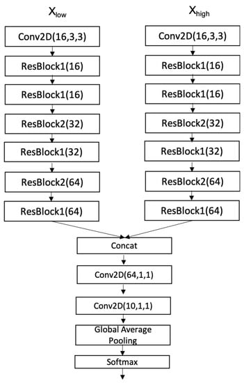 The ResNet baseline. The input is split into independent vectors by the mel frequency bins. The top 50% of the high frequencies form , and the remaining mel bins belong to . Each vector goes through a 2D convolution before connecting to the chain of residual blocks. Outputs from the chain of residual blocks are concatenated before running though two 2D Convolution operations to produce the output for the classification.