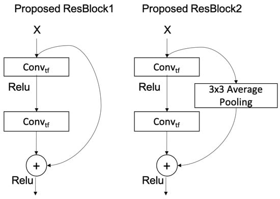 Two types of residual blocks are used in the baseline ResNet. ResBlock1 has the skip connection directly from the input of the block to the addition operation at the output, while ResBlock2 modifies the input x by an average pooling operation over a  window.