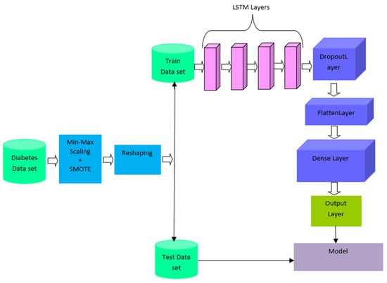 The novelty of the proposed work is its ability to handle unbalanced data in diabetes prediction. SMOTE is a common oversampling strategy for dealing with class-imbalanced data sets that produces new minority-class samples. After oversampling, the balanced data is reshaped into 3D data. Then the data is divided into training and testing data. Figure 1 shows the architecture of SMOTE-based deep LSTM. SMOTE is based on selecting the number of nearest neighbors, K = 5. LSTM accepts input data to be a 3D tensor such as batch size, timesteps, and features. The proposed model includes four LSTM layers. The overfitting problem is solved by using a dropout hyperparameter []. Adaptive moment estimation (Adam) is used for optimization. Table 2 shows the detailed layer-wise training process of the SMOTE-based deep LSTM model.