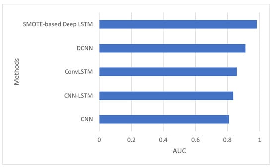 The AUC is a measure of a classifier’s ability to distinguish between classes. Figure 3 shows the AUC of several models such as convolutional neural network (CNN), convolutional neural network-LSTM (CNN-LSTM), ConvLSTM, DCNN, and the proposed model, SMOTE-based deep LSTM. The AUC of the proposed method was 0.983 which is better than other deep-learning methods.