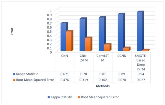 Generally, the perfect likeliness value is of above 0.90 []. According to Figure 4, DCNN had a Kappa coefficient [] of 0.89 and SMOTE-based deep LSTM had a Kappa coefficient of 0.94. Hence, SMOTE-based deep LSTM is a good classification model. The error term RMSE was found by comparing the outputs corresponding to each input. The RMSE of SMOTE-based deep LSTM was 0.051 less when compared to DCNN.
