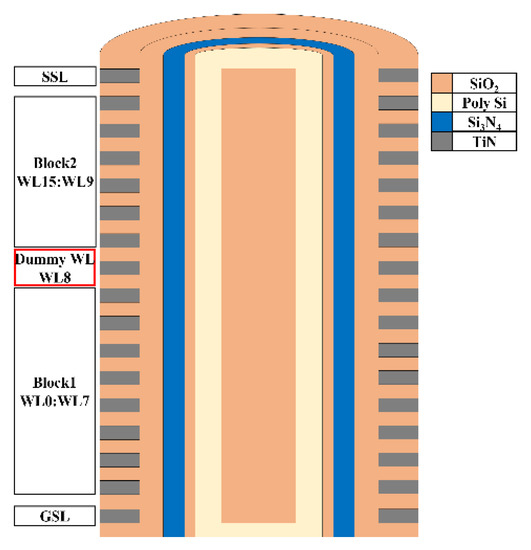 Figure 2 shows a cross-section of the 3D NAND flash memory structure that is used in technology computer-aided design (TCAD) simulation. The gate length was set to 30 nm for all of the main cells, string select line (SSL), and ground select line (GSL), and the gate spacing was also set to 30 nm. The thickness of the oxide/nitride/oxide (O/N/O), which is a dielectric constituting the center of the gate, was set to 4/8/8 nm, respectively [24]. Block1 was set as WL0:WL7 and block2 was set as WL9:WL15, which was divided into two blocks based on WL8 set as dummy WL.