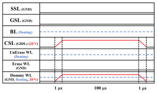 Figure 3 shows the timing diagram that was used for sub-block erase. For the erase operation, 0 V was applied to SSL and GSL, and 20 V VErase was applied to CSL. At this time, GIDL was generated by the potential difference between CSL and GSL; channel electrons leaked out and the channel potential rose. The WL of the Un-erase block was set to floating in order to reduce the potential difference between the channel and WL. A total of 0 V was applied to the WL of the Erase block in order to induce a potential difference between the channel and WL. The voltage of the dummy WL was simulated under the following three conditions: 20 V (VErase), 0 V, and floating.