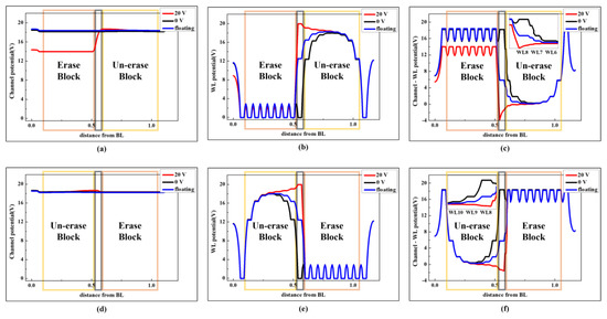 (a) Channel, (b) WL, (c) Channel–WL potential by VDummy during erase operation in block2, (d) Channel, (e) WL, (f) Channel–WL potential by VDummy during erase operation in block1.
