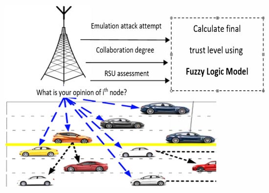 The detection models based on the trust evaluation process in VANET garner considerable interest due to their potential to preserve network stability and meet service application requirements’ quality []. The network, which is periodically contacted by certification and traffic control organizations, is used to validate the vehicles’ behaviour and determine their reputation levels. The receiver vehicles’ decision-making systems use the reputation of the communication nodes to assess the veracity or untruth of the communications. A novel architecture that protects data security and privacy has reduced the severity of many VANET attacks. In [], authors propose new security scheme for early detection of a black hole attack during the route discovery process. After computing the dynamic threshold value, the scheme generates a forged route request (RREQ) packet. A new security scheme was proposed in [] to allow nodes to determine the legitimacy of messages. To combine direct and indirect reputation reports, the uncertain deductive technique was used. In addition, game theory was employed to encourage nodes to cooperate. In [], the authors proposed a scheme for detecting malicious nodes. The trust for each node is calculated by gathering data about the node and feeding it into a fuzzy logic model that evaluates the node’s trust level. In [], the authors suggested a new approach for detecting Sybil attackers in VANET. The detecting parameters are signal strength measurements and Euclidean distance. The reward for each vehicle is determined by gathering RSU feedback on the vehicle’s behavior.