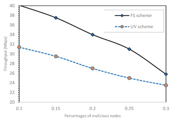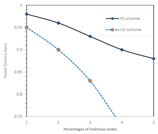 The packet delivery ratio is compared in our proposed scheme and UV scheme, as shown in Figure 4. The packet delivery ratio decreases with the increment of the number of malicious nodes in the network. It can reach up to 95% for our scheme. The accuracy of relying on packets is essential in allowing nodes to join VANET. Nodes that keep dropping packets are evicted from VANET using our scheme.