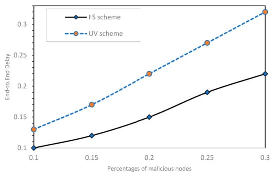 Figure 3 illustrates the end-to-end delay in our proposed approach compared to UV scheme. As the number of malicious nodes increases, the end-to-end delay increases in both schemes. Some nodes attempt to postpone relaying packets. Our scheme excludes these nodes by punishing them according to the cost function in equation (8). Nodes that act bad are excluded from VANET by our scheme. Figure 3 shows that our proposed scheme outperforms the UV scheme, i.e., the end-to-end delay is improved by up to 60%.