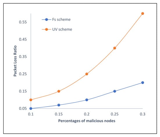 On the other hand, in Figure 5, we compare the packet loss rate in our proposed scheme and the UV scheme. Under the simulation used to measure the packet loss ratio of the two methods, the packet loss ratio drops quickly when fewer malicious nodes are relaying packets over the network. Our approach succeeds in having the minimum packet loss ratio, which outperforms the UV. Figure 4 illustrates that our scheme reduces packet loss ratio by over 50%.