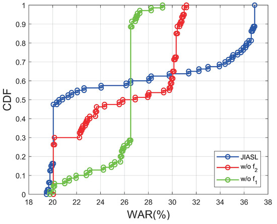 In addition, to evaluate the influence of the proposed optimization terms and w/o for cross-corpus SER tasks, we also calculated the cumulative distribution function (CDF) [39] with respect to WAR on the B → E task, shown in Figure 1, in which each point represents the WAR results of the specific iteration step, and w/o and w/o represent the proposed JIASL without the terms and , respectively. Figure 1 reveals two main advantages of our proposed JIASL. The first point is that our JIASL with the optimization terms of and can achieve the highest WAR result compared to the models of JIASL without and . The second point is that when the WAR is in the range of [20–26%], the CDF of JIASL is higher than JIASL without and . This case demonstrates that the proposed JIASL converges faster and has more rounds to reach a high WAR in all iterations.