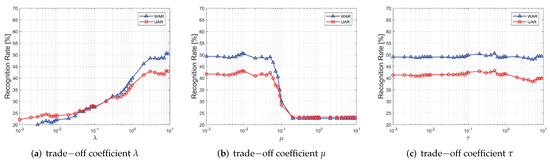 In our proposed JIASL, three trade-off coefficients (i.e., , , and ) are adopted to balance the different loss terms. Hence, we conducted additional experiments for the sensitivity analysis of these parameters to demonstrate the adaptation of JIASL. Figure 2 describes the results of the parameter sensitivity analysis on the cross-corpus SER task of E → B, in which the optimal parameters for , , and under this task are , , and , respectively, and the search set of parameters was set as [0.001:0.001:0.009, 0.01:0.01:0.09, 0.1:0.1:0.9, 1:1:9]. From Figure 2a, it is obvious that the recognition accuracies of WAR and UAR vary gently with the in [2, 9], demonstrating that JIASL is insensitive to in the optimal parameter interval [2, 9]. Similarly, Figure 2b reveals that the proposed method is susceptible to in the parameter interval [0.001, 0.4]. Moreover, from Figure 2c, we can observe that the recognition rate is flat enough in the whole parameter interval of . These results all indicate that our proposed JIASL is insensitive to three trade-off coefficients.
