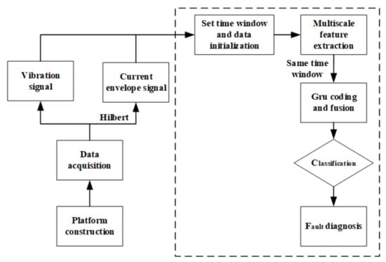 To overcome the limitation of the above problems and improve the classification accuracy and model robustness in the fault diagnosis, a new feature fusion fault diagnosis model based on the convolutional neural network (CNN) is proposed. The vibration and current signals of the motor are input into the improved CNN. The sampling is conducted by different time windows with input into the feature extraction module of multi-scale combined attention mechanism later, and the features of vibration and current signals extracted synchronously in the same time window are encoded and fused in the time series by the recurrent neural network (GRU). Refer to Figure 1 for the overall process. The vibration signal and current signal are used by the method at the same time. Compared to other methods, the model put forward in this paper is capable of accurately studying the corresponding fault feature from different signals with the relation between different signals in time series explored. The main contributions of this paper can be summarized as follows: