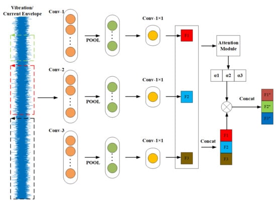 Here the refers to series connection function. The sensitivity of the model to fault extraction and the accuracy of fault diagnosis can be improved by adding adaptive attention modules. The above multi-scale feature extraction module (MFBAM) based on the attention mechanism for single data flow is shown in Figure 4.