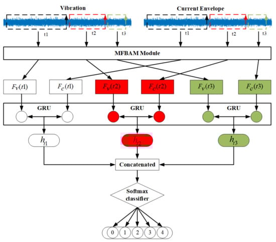 The vibration and current feature vectors extracted from the same time step are further coded and fused based on time series information by a group of GRU units. When the time step is t, the GRU input is as follows: