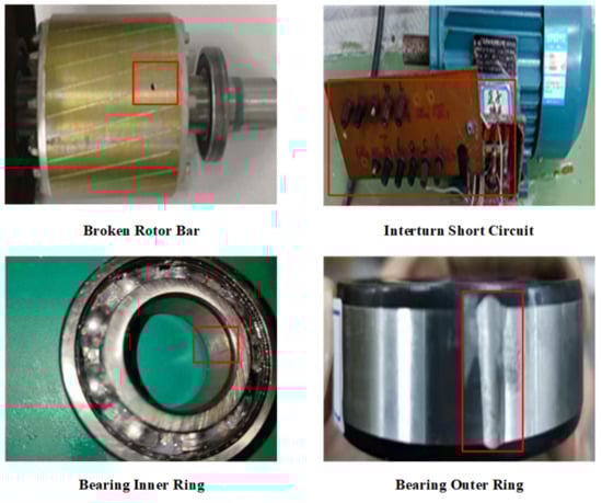 The special treatment for different parts of the motor subject to the same model is mainly used to realize the simulation of the motor fault, and the signals of four fault motors and healthy motors are mainly collected in the experiment. Four faults refer to rotor broken bar fault, inter-turn short circuit fault, bearing outer ring fault and bearing inner ring fault. The fault simulation way is as follows:
