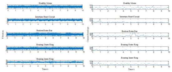 To verify the performance of the CNN fault diagnosis model based on feature fusion proposed, the data collection device is used to collect the vibration and current signal of the motor under five different healthy states based on no load, 25% load, 50% load and 75% load, and the sampling frequency of the data collection card is set to 48 KHZ. Refer to Figure 9 for vibration signal waveform and current envelope signal collected from the motor under different states based on no load. To verify the robustness of the model, the data of the motor under each state collected under the condition of variable load will not be particularly distinguished, so there are five sets of data. The dataset is created by the vibration and current signal collected from five groups of motors under different states. Some 1200 samples are extracted from each group (300 samples under each load state). Each sample contains 1000 vibration signal points and 1000 current envelope signal points. Then five different sets of vibration and current signals are labeled from Category 0 to Category 4, and all samples are used to form the dataset (as shown in Table 3).