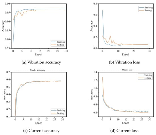 From the above experimental results, the classification accuracy of the model with vibration signal as input is better than the model with current signal as input during the training process. This means that it is more difficult for the fault diagnosis model to learn fault features from current signals than from vibration signals. The model performs worse when the current dataset is the input, indicating the model’s insufficient generalization ability. Although the model proposed in this paper has high classification accuracy and fast convergence speed when the vibration signal is input, there is some gap between the model accuracy and input of the training set and the test set, indicating a slight overfitting problem in the experimental process with the vibration signal as input.