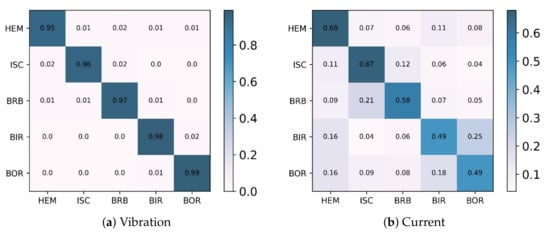 The fault diagnosis experiment results of single vibration signals and single current signals are shown in Table 5; the accuracy and loss of the two different models during the training and testing of the experiment are shown in Figure 10; the confusion matrix is shown in Figure 11.