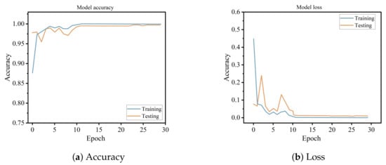 For the fairness of the experimental comparison, in the multi-feature fusion experiment with the vibration signal and the current signal as the input, the parameters were set consistent with the parameters of the single signal input. The same performance indicators were used during the experiment, and the time of training and testing was recorded. The results of fault diagnosis experiments with multi-feature fusion are shown in Table 6; the accuracy and loss during the experimental training and testing process are shown in Figure 12; the confusion matrix is shown in Figure 13.