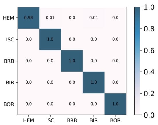 T represents the number of samples under the correct model classification; F represents the number of samples under the wrong model classification; and represent the number of correctly classified samples and the total number of samples of the model with different signals as inputs. Adam optimizer was selected to reduce the total loss, and the initial learning rate was set as 0.001. The learning rate of Adam can be adjusted with the training adaptation. The process of model training ended with the stopping of classification accuracy, and the time of training and testing was recorded. To verify the robustness of the model, the whole experiment was repeated 30 times, and all procedures were performed under the deep learning framework—TensorFlow.