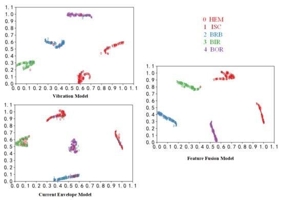The t-SNE can be deemed as one of the most effective data dimension reduction and visualization methods now. When the high dimensional dataset is classified, but whether the dataset is of good separability is unclear, t-SNE can be used to project the data to a 2D or 3D space for observation. To more intuitively reflect the effectiveness of the feature fusion method proposed in this paper, the t-SNE visualization sample processing is performed. Refer to Figure 14 for 2D results of t-SNE visualization. According to the figure, five states of the motor can be accurately clustered in the feature fusion model, and the motor features under different states are clearly classified. By contrast, the feature extracted by the single-signal model fails to be clustered very well. The single vibration signal is with a few test sample clustering errors, and the single current signal has with plenty of test sample clustering errors. The above discussion shows that the multi-signal feature fusion model proposed in this paper has greatly reduced the loss of fault information and has a very good feature extraction effect.
