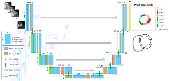 A fully convolutional neural network architecture (U-Net) [] was adopted for segmentation. Our U-Net model was fed with full FOV single-slice raw T2* multi-echo images (array of 256 × 256 × 10) and was trained to give as output the corresponding 7-classes mask (Figure 1). Each block of our U-Net consisted of two convolutional layers with a kernel size of 5 × 5 (stride 1 and padding 1) with a 1 × 1 convolutional layer in between to reduce the depth of the feature maps and, in turn, reduce the total number of network parameters. The Rectified Linear Unit (ReLU) was used as an activation function, and batch normalization layers were inserted after each convolutional layer. Max pooling layers were used for downsampling, while transposed convolution layers (stride 2, padding 2) performed the upsampling of the feature maps to restore the original size of the input image. The output of the last convolutional layer was a 256 × 256 × 7 array of scores representing the 7 segmented classes, which were converted to normalized probability values via a softmax function. Finally, the predicted segmentation mask was obtained by pixel-wise application of the argmax function on softmax probabilities.