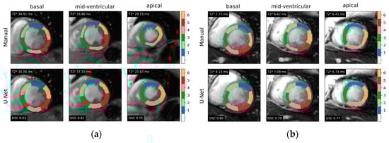Representative examples of 16-segment AHA model myocardial segmentation from gradient-echo multi-echo T2* images in two testing cases: (a) subject with normal T2* values and (b) patient with iron overload. Ground-truth label masks (upper panels) and U-Net-based segmentations (lower panels) are shown for each of the three myocardial slices. Global T2* derived from the segmentation and Dice similarity coefficients (DSC) are also indicated.