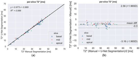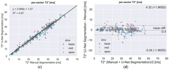 There was a strong correlation between the automated and manual T2* measurements in the per-slice (Figure 3a) and per-segment (all together; Figure 3c) analyses. The Bland–Altman plot (Figure 3b,d) showed narrow limits of agreement (per-slice: 3 ms; per-sector: 5 ms) between the two assessments with no bias (<1 ms).