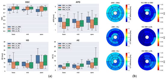 Inter-observer variability of the two experts compared to the fully-automated method. (a) Boxplot of the segmentation metrics. (b) Bull’s-eye plots showing the regional distribution of segmental T2* differences according to the AHA model (left panels) and ICC between observers and the DL-based method (right panels).