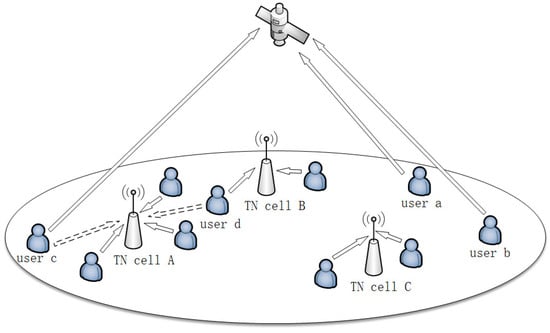 Coinciding with the development of 5th generation (5G) technology, users have higher data requirements and are widely distributed []. Due to the uneven distribution of data requirements, the frequency resource utilization in any system will be also unevenly distributed. Cells with high resource utilization are called overloaded cells. These cells have less available resources, which may affect the quality of service (QoS) for users. Load balancing means to transfer some traffic from overloaded cells to other available cells to balance the frequency resources among cells. It is an important method to optimize resource utilization and improve QoS. Reference [] reviews the historical developments of load balancing and provides guidance and a roadmap for developing load balancing. However, there is a growing demand for high-rate communication in remote areas with sparsely deployed terrestrial cells. In these areas, the frequency resources are insufficient, such that the cells are more likely to overload. What is more, neighboring cells found by traditional load balancing schemes may not suit being the offloading target cells due to the limitation of coverage. Since neighboring cells are not always available, reference [] suggests using cells with high coverage to achieve load balancing. According to the architecture of the future network [], non-terrestrial cells will provide coverage for these suburban, rural and island areas. Therefore, this paper studies an effective scheme for a satellite–terrestrial integrated network (STIN) to solve the overloading problem.
