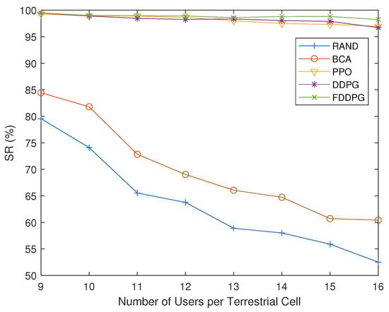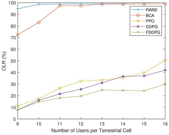 Results with different access algorithms are shown in Figure 5. RAND means users access randomly, which is considered as the lower limit. BCA [] means users access with the best channel state. As the number of users increases, the OLR increases for all algorithms. The purpose of designing FDDPG and FLRL-AC was to pre-process the factors affecting overloading by ANFN and to reduce the training difficulty of the network in a high-dimensional state and action space. Additionally, the FEM calculated by ANFN gives a more accurate evaluation of the impact of users on overloading. Therefore, taking the statistics of FEM as the reward function could enable the agent to make better decisions. The advantages brought by FDDPG are not obvious when the number of users is small and the training dimensions are not too high. Therefore, the three curves of PPO, DDPG and FDDPG are close. As the number of users increases, the results of BCA become unacceptable because the resources of NTN cell are not effectively utilized, resulting in overloading of TN cells. PPO and DDPG have similar performances to the two baseline algorithms, and the gain brought about by FDDPG becomes more and more obvious with the increase users: up to 29%.