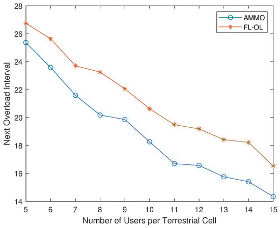 In order to evaluate the performance of the offloading algorithm, a special user dropping method was used. Two of the cells with more users were dropped to emulate overloading. Additionally, users accessed cells based on the basic algorithm, BCA. The proposed FL-OL is compared with AMMO. Whenever overloading occurred, the two offloading algorithms were utilized, respectively, to offload users to other available cells. After a period of time, the cell could overload again due to the dynamic changes of the environment. The time interval of the first or second overload time is called the next overload interval. Although the current signal reception quality of some users is poor, they may be moving toward the current serving cell and away from adjacent cells. Such users are likely to be selected if the offloaded users are selected only according to RSRP, which may bring a heavy load to the adjacent cell. The rate requirement is also an important factor. Low rate users have little impact on the overloading and should have a lower priority for being offloaded. Unlike AMMO, FL-OL takes the above factors into account by introducing FEM and should be able to prolong the time with a balanced load for the system.
