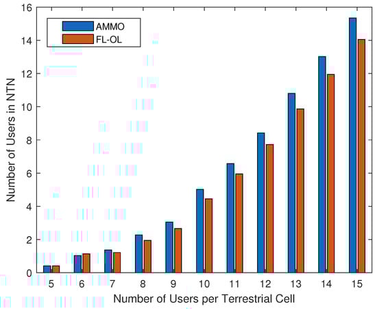 With an increase in users and limited TN frequency resources, it is more difficult to balance load when only relying on TN cells. The number of users served by each satellite is increasing. However, there are always less users offloaded to NTN with the proposed FL-OL due to it making more effective use of the TN’s resources. As shown in Figure 8, FL-OL reduces users affected by the delay of long-distance transmission of satellite-user link by up to 14% compared with the existing algorithm.