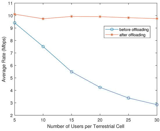 Furthermore, to verify the effectiveness of the proposed algorithm, Figure 9 shows the average data rate before and after offloading. With an increase in users, the limited resources of the overloaded cell struggle more difficult to meet users’ rate requirements so that the average rate decreases significantly. After performing offloading, the average rates increased by 10% to 70% with different user numbers, and users basically met their target data rates. The results show that overloading will significantly affect QoS, and once again verifies that the scheme of reducing the overloading through active load balancing in this paper is meaningful.
