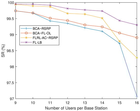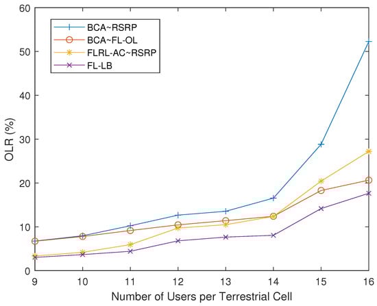 Results in Figure 10 and Figure 11 show that BCA∼RSRP had the worst performance with all user numbers because it does not consider any dynamic changes in the environment. FLRL-AC∼RSRP performed better with smaller numbers of users, and BCA∼FL-OL performed better with larger number of users. This is because in the two parts of the FL-LB, the access algorithm plays a more important role when the number of users is small. No matter how good the access decision is, overloading will occur when the number of users is too large. Therefore, a better offloading algorithm should be used for the overloading cells in time. This is the reason why the FL-LB proposed in this paper retains the reactive load balancing part. Finally, FL-LB had the best performance with all user numbers. Therefore, FL-LB can effectively reduce the occurrence of overloading in a longer term and improve QoS for users in STIN.