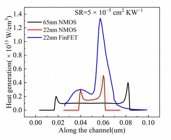 To investigate the impact of self-heating, the thermal performances of different devices were compared. We took the lattice temperature and heat profiles under SR = 5 × 10−5 cm2 KW−1 as an example to illustrate that self-heating becomes increasingly serious in small-scale devices, as shown in Figure 2. This is because the shrinking of voltage is not proportional to the device size [], leading to an enhancement of the electric field in the channel, which further results in an increase in the thermal energy, as shown in Figure 3. In particular, the heat generation of the NFinFET was higher than the 65 nm and 22 nm NMOS. This is because the narrow fin-shaped channel region results in enhanced phonon-boundary scattering, which significantly affects thermal conductivity and increases thermal resistance. In addition, since the thermal conductivities of SiO2 and HfO2 surrounding the channel in the FinFET are 0.014 WK−1 cm−1 and 0.023 WK−1 cm−1, respectively, which is less than the thermal conductivity of the silicon substrate in the NMOSs, the heat accumulates. Therefore, we adopted the NFinFET for further investigation of the impact of the self-heating effect and HCI.